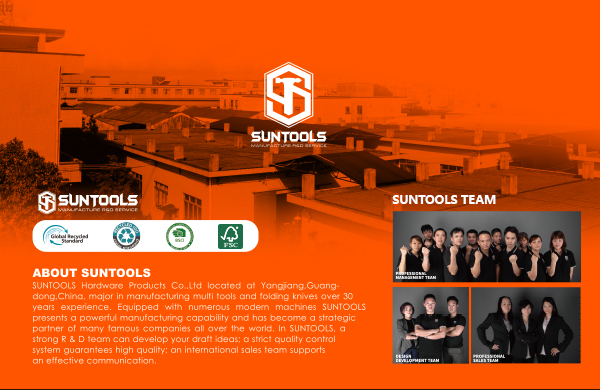 Yang Jiang Suntools Co., Ltd. specializes in producing Multi tools, Multi knives, folding knives, Multi pliers, Gift tools, Bottle openers and BBQ tools. Our products are sold to clients all over the world. Our company is located in Yangdong Industrial Park, Yangjiang City, Guangdong Province, China. We enjoy convenient transportation. Our factory covers an area of more than 4000 square meters.